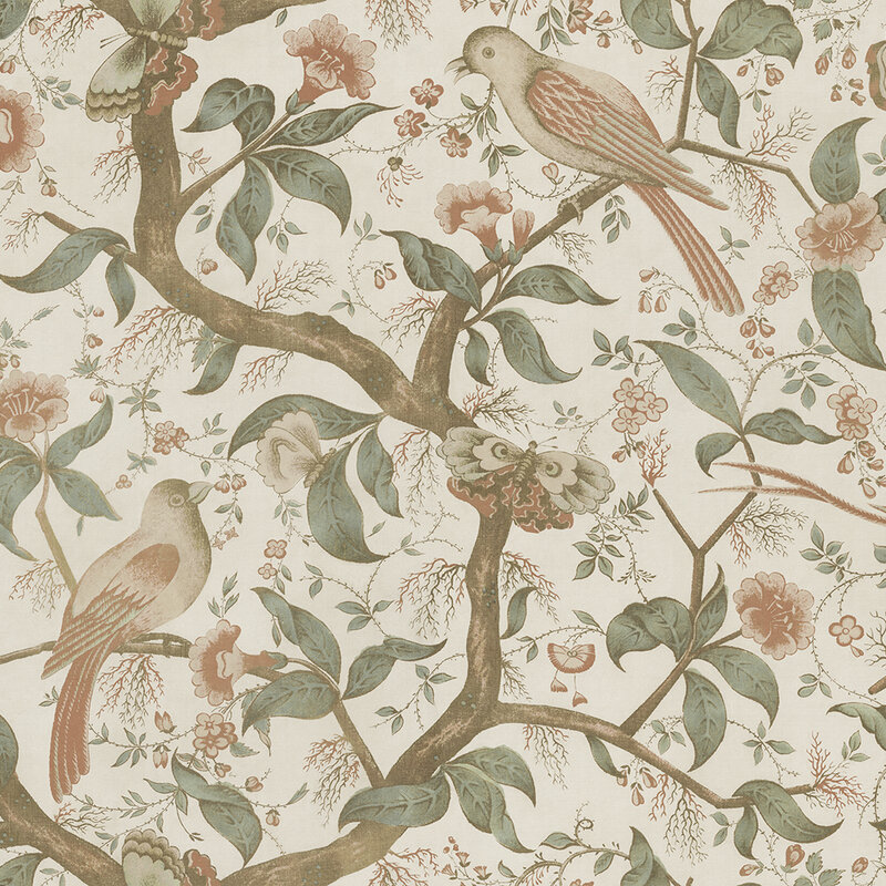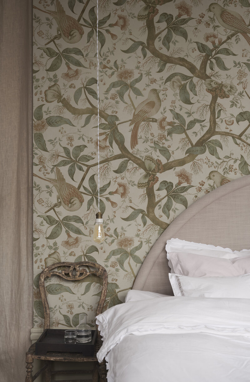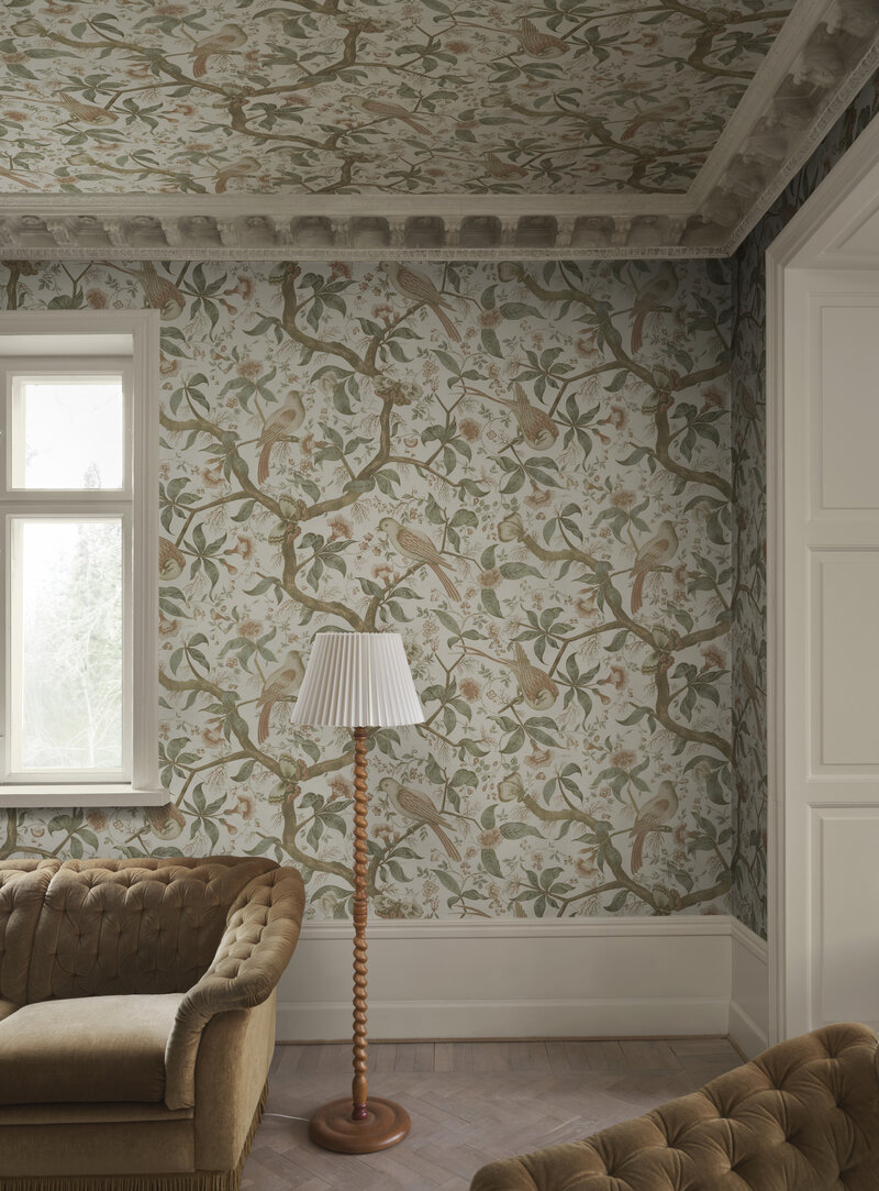 Alexa veggfóðrið er innblásið af suður-evrópskri antík textílmynd. Blómstrandi tré með fantasíufuglum skapa heillandi garðmynd á veggina. Mild og rómantísk fagurfræði hvíslar sögum frá liðinni tíð.