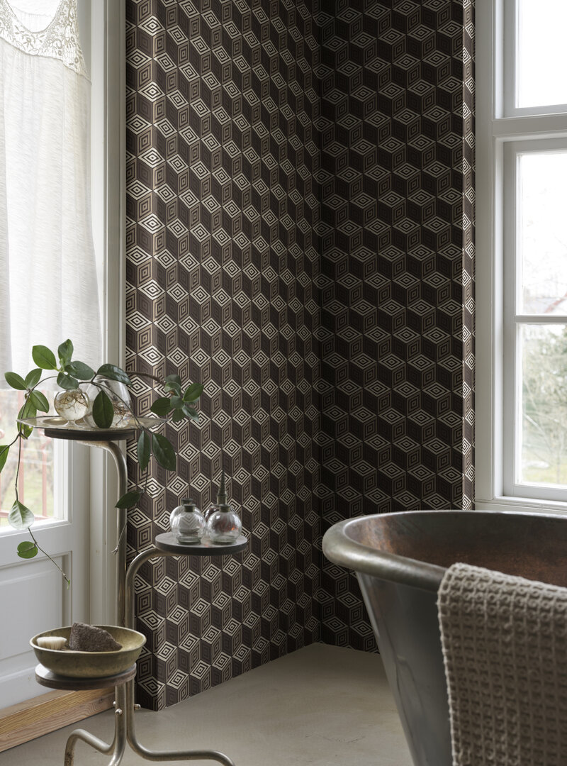 Chiara er heillandi geómetrískt mynstur sem minnir á glæsilegt silki. Þetta smágerða veggfóður geislar af alþjóðlegum blæ með sínum kraftmiklu teningum og ríkulegu litapallettu. Fullkomið til að skapa nútímalegt og fágað andrúmsloft. Hönnun: Sara Bergqvist.