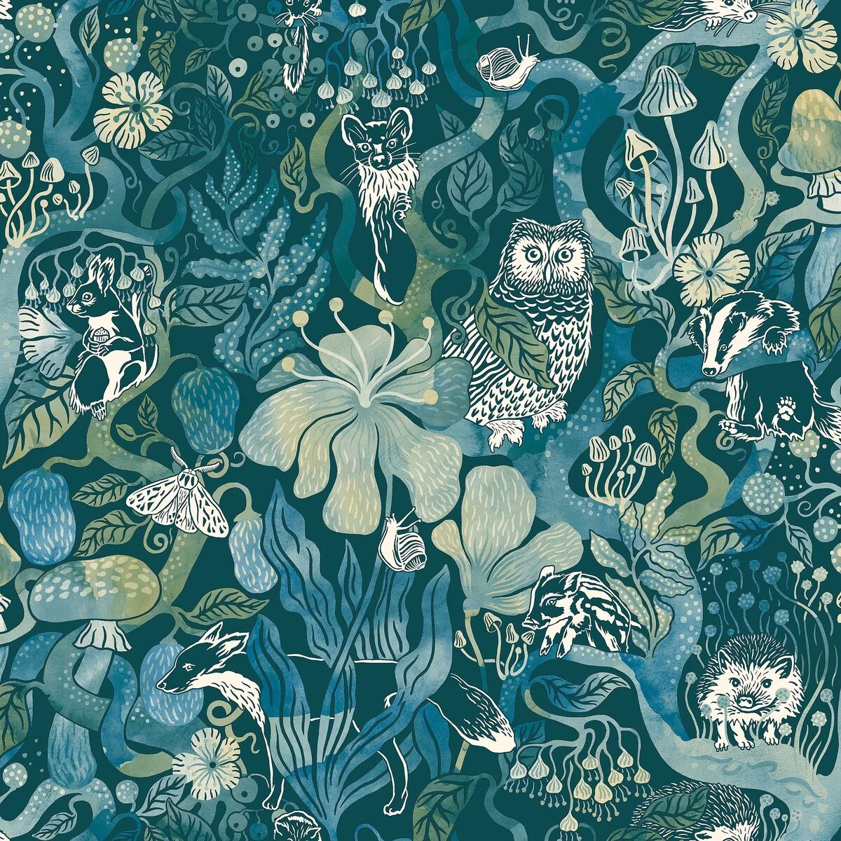 Velkomin í töfraskóginn Magic Woods! Barnaveggfóðrið er spennandi sögubakgrunnur með gróskumiklum skógi, fullum að sætum dýrum meðal blóma, berja, sveppa og laufblaða. Mynstrið er byggt upp eins og klippimynd, þar sem skógurinn er málaður í vatnslitum á meðan broddgölturinn, íkorninn, uglan og önnur dýr eru handteiknuð í mynstrið.